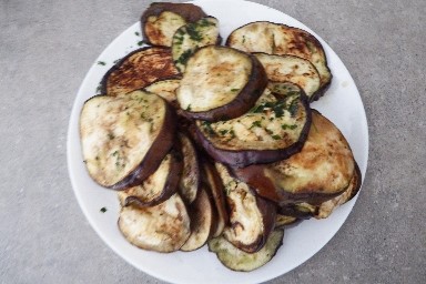 • Schneide die Auberginen in Scheiben mit einer Dicke von einem halben Zentimeter. Lege sie in eine Schüssel mit kaltem Wasser und einer Prise grobem Salz. Lass sie 30 Minuten ruhen. Nach der Zeit spüle sie gründlich ab, tupfe sie mit Küchenpapier trocken und grille sie auf dem heißen Rost. Lege sie auf den Teller, würze sie mit einem Schuss extra nativem Olivenöl, Salz, Pfeffer und frisch gehackter Petersilie
