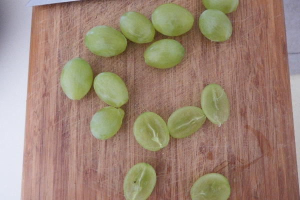 Waschen Sie die Trauben gründlich, tupfen Sie sie mit Küchenpapier ab und legen Sie sie auf das Schneidebrett. Schneiden Sie jede Traube in zwei Hälften und entfernen Sie die Kerne mit einem kleinen, scharfen Messer