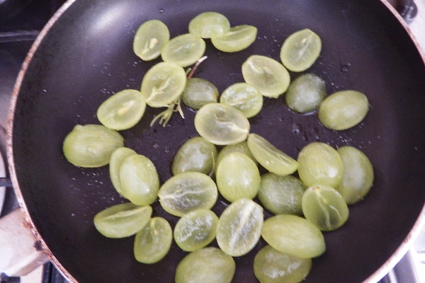 Geben Sie den Honig mit dem Rosmarinzweig, den Trauben und einer Prise Salz in die Pfanne. Kochen Sie bei schwacher Hitze etwa 5-10 Minuten, bis die Trauben karamellisiert sind, jedoch ihre Konsistenz behalten. Schalten Sie die Hitze ab und stellen Sie beiseite.