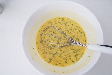 In der Schüssel mische das Mehl mit der Milch, bis ein klumpenfreier Teig entsteht. Füge die Eier, den Schnittlauch, Salz und Pfeffer hinzu