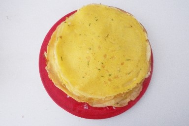 Schmelze 20 g Butter in einer Antihaftpfanne, gieße eine Kelle Teig hinein und lass das Omelett 2 Minuten kochen. Wende es mit dem Spatel und lass es eine weitere Minute kochen. Lege das Omelett auf einen Teller und setze die Zubereitung der weiteren Omeletts fort, indem du die Pfanne jedes Mal mit Butter einfettest.