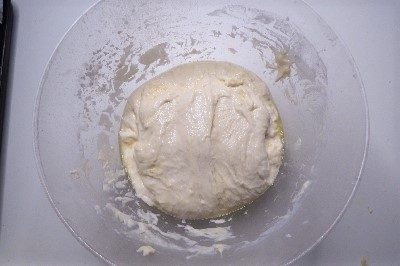 Füge schließlich das extra native Olivenöl und das feine Salzhinzu und mische es mit dem Spatel gut durch, bis eine sehr weiche und klebrige Kugel entsteht