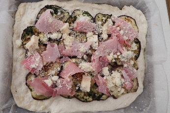 Lege die gegrillten Auberginen auf den Teig, lasse die Ränder frei