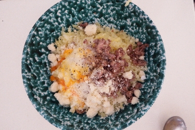 Gib in die Schüssel die gekochten und zerdrückten Kartoffeln, das zerkleinerte Zucchinifleisch, 30 Gramm geriebenen Grana Padano,das Ei, die Wurst, würze mit Salz und Pfeffer und mische sorgfältig.