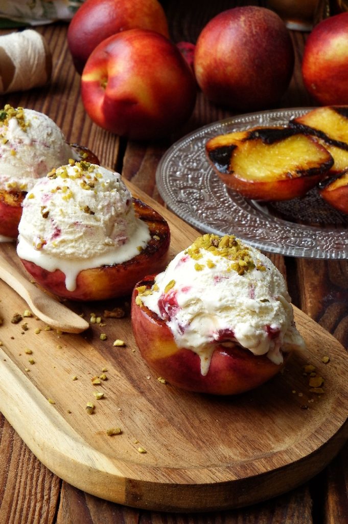 Die gegrillten Pfirsiche mit Eis sind ein sehr schnelles Sommerdessert, perfekt, um es nach dem Abendessen an warmen Sommerabenden zu servieren.