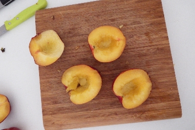 • Wasche die Pfirsiche, schneide sie in zwei Hälften und entferne den Kern mit Hilfe eines Ausstechers oder eines scharfen Messers.
