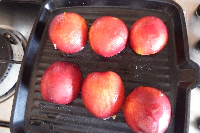 • Erhitze die Grillplatte auf dem Herd, lege die Pfirsiche mit der Schnittfläche nach unten auf die Flamme. Koche sie etwa zwei Minuten, bis sie grillstreifen haben.
