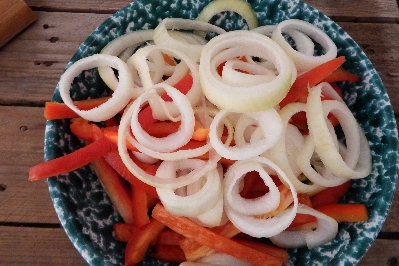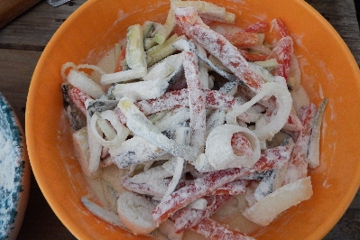 Waschen und putzen Sie das Gemüse. Schneiden Sie die Zucchini und die Paprika in dünne Streifen und die Zwiebeln in Ringe. Geben Sie alles in die Schüssel. Mehl über das Gemüse streuen und mit den Händen gut vermischen.