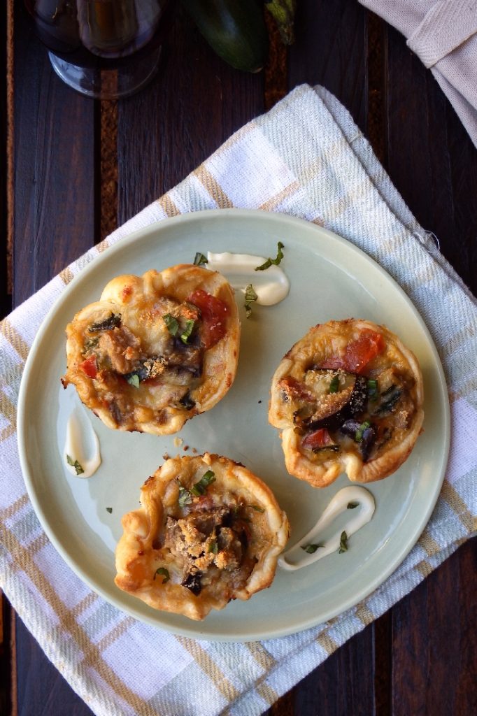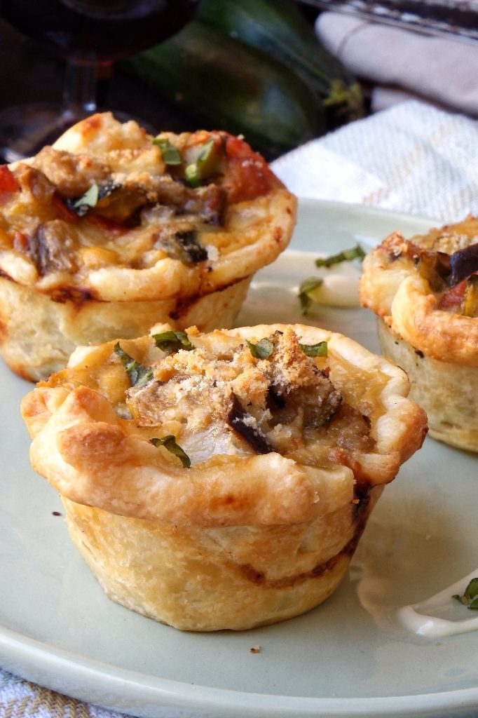 • Gib das abgekühlte Gemüse in eine Schüssel zusammen mit der in Würfel geschnittenen Mozzarella, dem geriebenen Grana Padano und dem Ei und mische alles gut. In der Zwischenzeit rolle den Blätterteig auf seinem Backpapier aus und steche mit einem Ausstecher sechs Scheiben aus, die etwas größer sind als jede Muffinform.