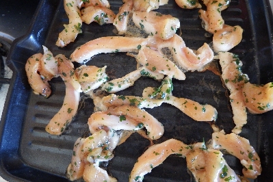 Schneide das Huhn in Streifen, lege es in die Schüssel mit der Sojasauce, den gehackten Kräutern, der gehackten Knoblauchzehe und mische gut. Bedecke die Schüssel mit Frischhaltefolie und lasse sie eine Stunde im Kühlschrank ruhen. Nach der Zeit erhitze die Gusseisenplatte auf dem Herd, lege die Hühnerstreifen darauf und grille sie.