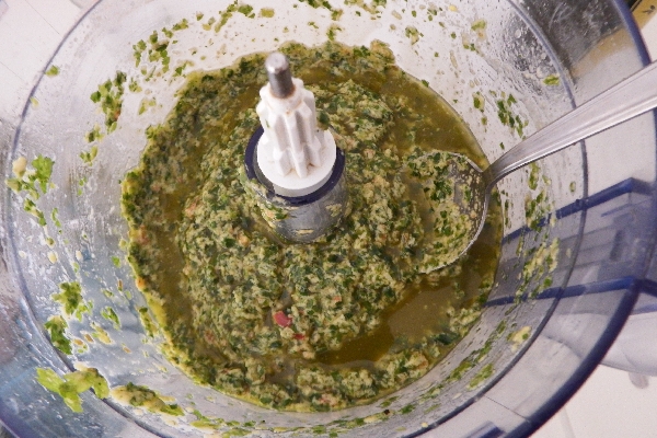Füge das Öl nach und nach hinzu und püriere alles, bis du eine weiche und homogene Sauce erhältst. Ich empfehle, die grüne Sauce einige Stunden vor dem Servieren vorzubereiten und sie im Kühlschrank in einem Glas zu lagern, bevor du sie mit gekochtem Fleisch oder Frikadellen servierst. Guten Appetit!