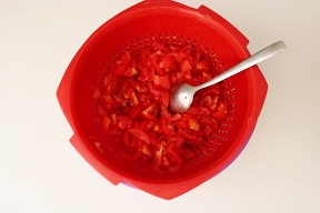 • Die Tomaten in kleine Stücke schneiden und die Kerne entfernen. In ein Sieb mit einer Prise Salz geben, mischen und 30 Minuten ruhen lassen