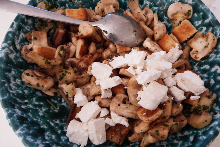 • Zum Schluss den Feta, die Brotwürfel und die Tomaten hinzufügen. Sorgfältig mischen, falls nötig mit Salz und Pfeffer abschmecken und servieren. Guten Appetit!