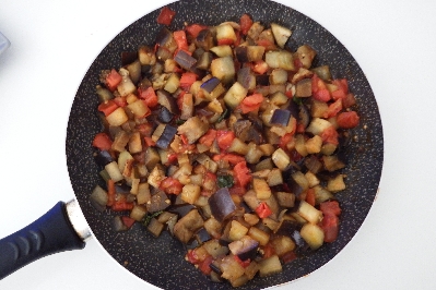 • Jetzt, wo unsere Auberginen fertig sind, kümmern wir uns um das Huhn. Aber zuerst übertrage das Gemüse auf einen Teller und bewahre die Pfanne auf