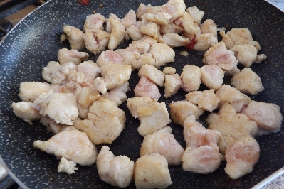 • Schneide zunächst das Huhn in Würfel und mehle es. Füge etwas Öl in die Pfanne hinzu, in der du das Gemüse gekocht hast, und gib das Huhn hinein