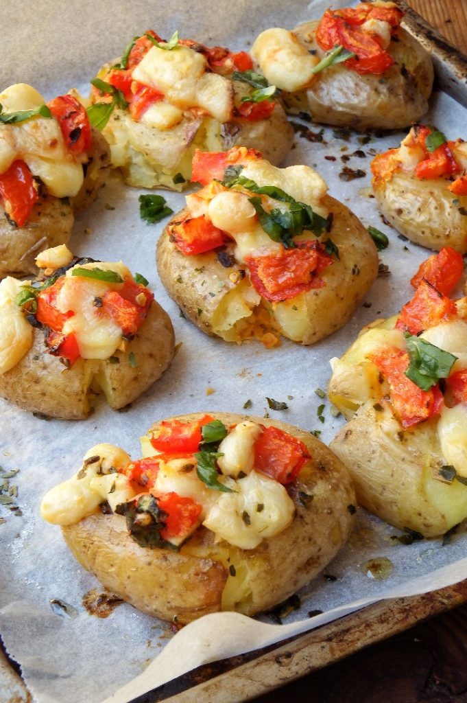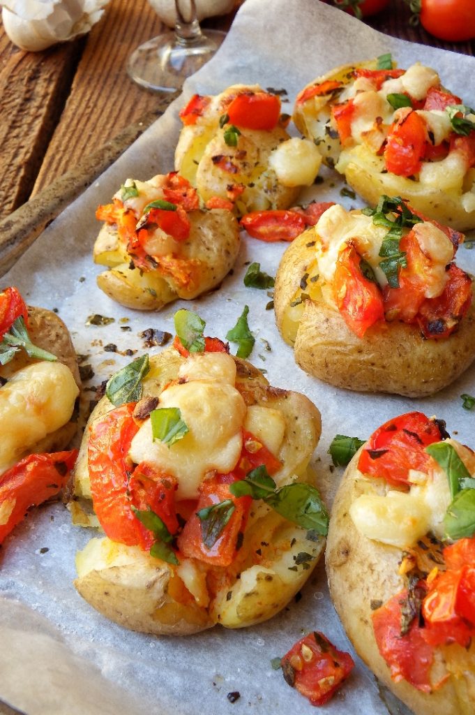 Belege die Kartoffeln mit den Tomaten und Mozzarellawürfeln und stelle sie in den Ofen unter den Grill bei 200 Grad, bis der Käse vollständig geschmolzen ist. Herausnehmen, die Kartoffel-Bruschetta mit frischem Basilikum garnieren und sofort servieren. Guten Appetit!