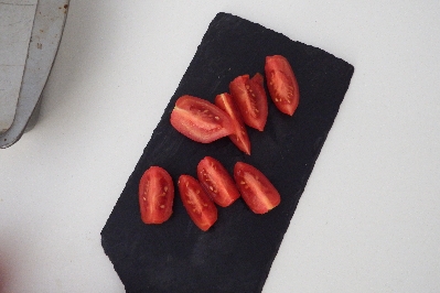 Schneide die Tomaten in Würfel