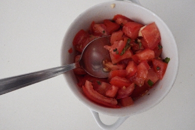 Gib die Tomaten in die Schüssel mit dem gehackten Knoblauch und Basilikum. Würze mit Salz, Pfeffer und einem Schuss Öl. Mische und stell beiseite