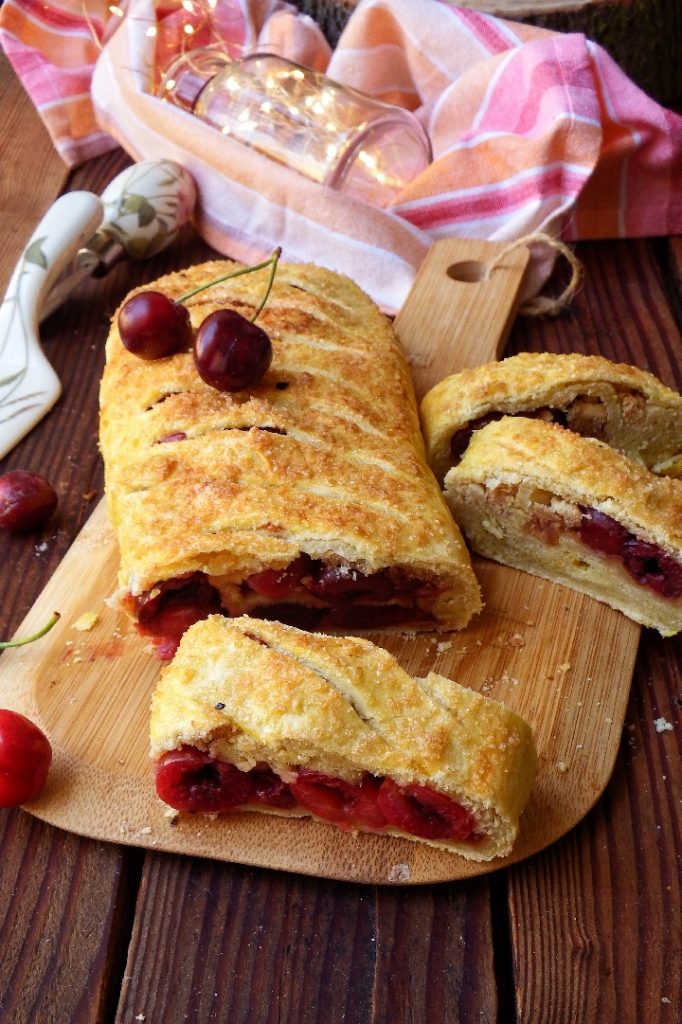 Der Kirschstrudel ist ein köstlicher rustikaler Sommerkuchen, bestehend aus einem knusprigen Teigmantel, der eine reichhaltige Füllung aus Kirschen und Keksen umhüllt.