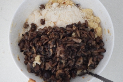 Füge die gehackten Pilze, die Petersilie, den geriebenen Grana Padano, den in sehr kleine Würfel geschnittenen Käse und das Mehl hinzu.