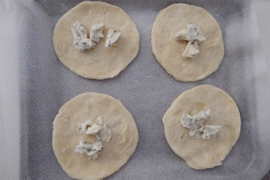 Legen Sie in die Mitte jedes Kreises Stücke von Gorgonzola oder einem Weichkäse Ihrer Wahl
