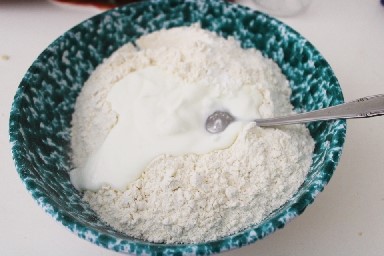 Gib das Mehl mit dem griechischen Joghurt, dem Backpulver und dem Salz in die Schüssel.