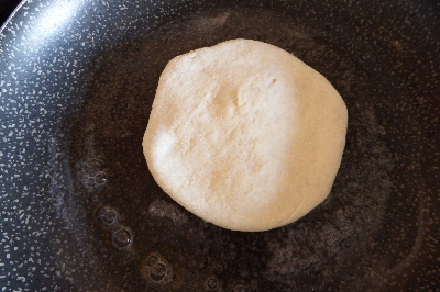 Die Brötchen auf der heißen Pfanne auf beiden Seiten braten, bis sie goldbraun und aufgebläht sind