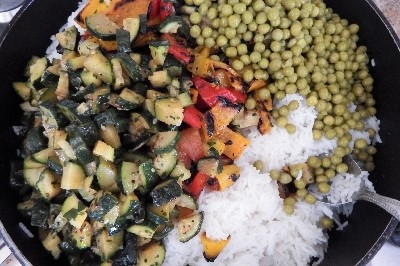 Füge dem Reis die Zucchini, Paprika und Erbsen hinzu.