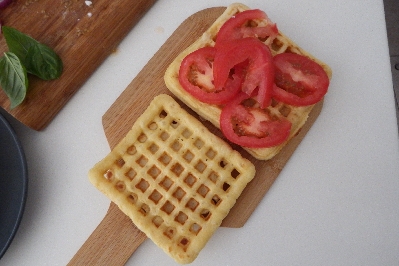 Lege die Tomaten auf die Waffel, würze mit einer Prise Salz, Öl und einigen mit der Hand zerkleinerten Basilikumblättern