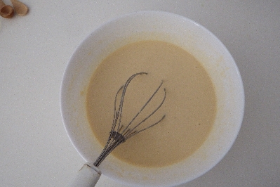 Gib die Eier mit der Milch und dem nativem Olivenöl extra in die Schüssel, würze mit einer Prise Salz und schlage mit dem Schneebesen. Füge den geriebenen Grana Padano, das Mehl und die Instanthefe hinzu. Arbeite mit dem Schneebesen, bis ein glatter Teig ohne Klumpen entsteht.