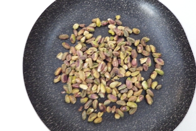 • Zuerst 100 Gramm Pistazien in einer Pfanne rösten, abkühlen lassen und dann zusammen mit dem Zucker zu Pulver mahlen