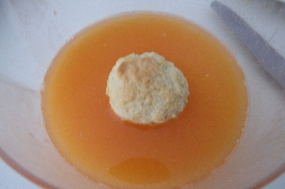 Nimm die Castagnole aus dem Ofen und tauche sie in den Orangensaft, alternativ kannst du Alchermes, Rum, Limoncello oder Nequik verwenden