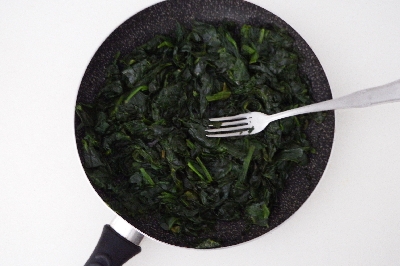 Wasche die Spinatblätter und koche sie bei mittlerer Hitze mit geschlossenem Deckel, bis sie verwelkt sind. Schalte die Hitze aus und lass sie abkühlen.