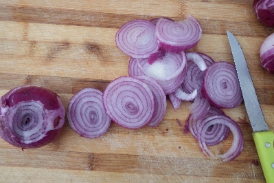 • Als Erstes die Zwiebeln schälen, waschen, trocknen und in dünne Scheiben schneiden