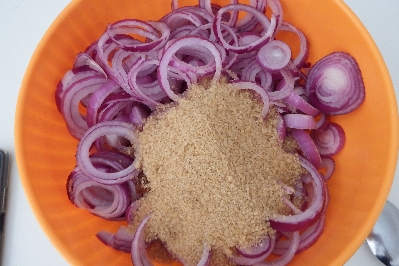 • Die geschnittenen Zwiebeln in eine Schüssel geben, den Zucker, den Rohrzucker, den Roséwein oder auch den stillen Weißwein und die Zimtstange hinzufügen