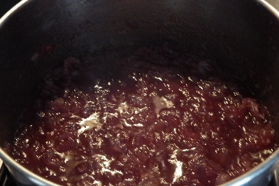• Sie werden feststellen, dass die Farbe allmählich dunkler wird. Wenn Sie eine weniger dicke Marmelade wünschen, können Sie das Gemisch mit einem Stabmixer pürieren