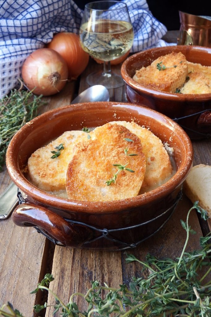 Die Zwiebelsuppe, die ich Ihnen zeigen werde, ist ein sehr altes Familienrezept französischer Inspiration, bei dem in der Gratinierschritt jedoch kein Gruyère, sondern geriebener Grana Padano verwendet wird.