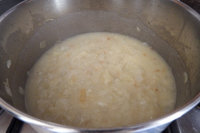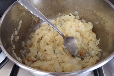 Schälen Sie zuerst die Zwiebeln und schneiden Sie sie dünn. Geben Sie sie in die Pfanne mit der Butter und dem Öl und braten Sie sie 20 Minuten lang, dabei häufig umrühren, damit sie nicht anhaften