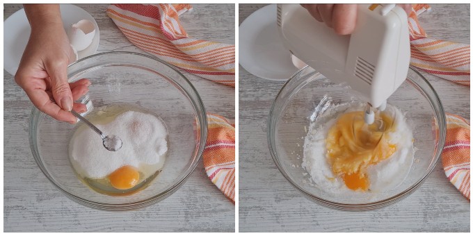 Zucker, Eier und eine Prise Salz in eine Schüssel geben. Mit dem elektrischen Mixer schlagen, bis die Masse hell und schaumig ist.