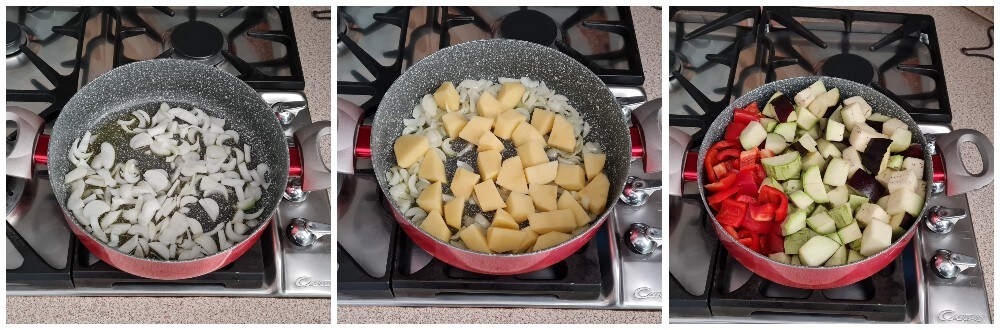 Das vorbereitete Gemüse (Auberginen, Paprika und Zucchini) hinzufügen, umrühren, abdecken und 10 Minuten bei schwacher Hitze garen.