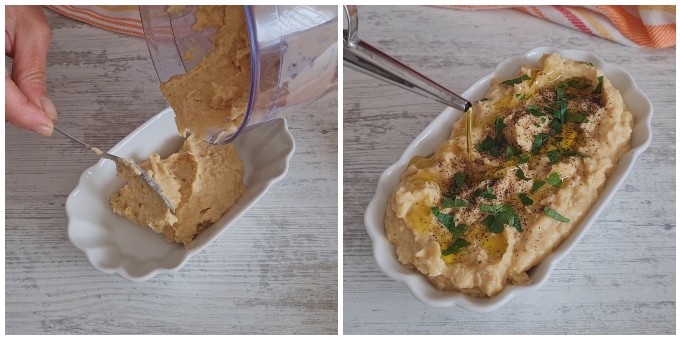 • Wenn das Hummus fertig ist, geben Sie es in eine Schüssel und garnieren Sie es mit ein paar Prisen Pfeffer, gehackter Petersilie und nativem Olivenöl extra.