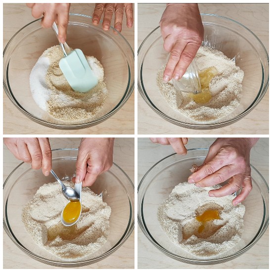 In einer Schüssel das Mandelmehl und den Zucker gut vermengen; die leicht geschlagenen Eiweiße, den Honig und das Mandelaroma hinzufügen.