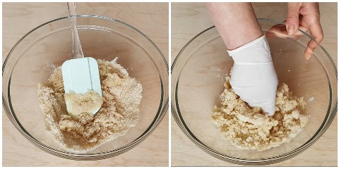 • Alles zunächst mit einem Spatel, dann mit der Hand vermengen, bis eine gut gemischte und kompakte Masse entsteht.