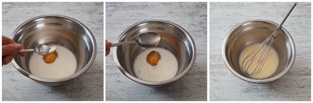 Geben Sie die Eier, Zucker, Milch und eine Prise Salz in eine Schüssel; fügen Sie das Öl (oder falls gewünscht die geschmolzene Butter) hinzu und schlagen Sie alles mit einem Schneebesen oder elektrischen Rührgeräten gut durch.