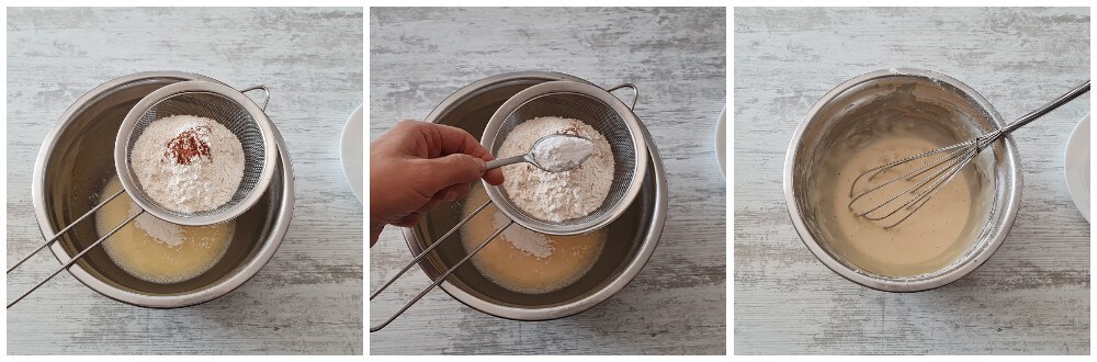 Fügen Sie das Mehl, einige Prisen Zimt und das gesiebte Backpulver hinzu; gut vermischen.