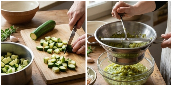 Waschen Sie die Zucchini, entfernen Sie die Enden, schneiden Sie sie in Würfel und geben Sie sie in einen Topf; salzen Sie, fügen Sie den Knoblauch, den Oregano, 1 Glas Wasser hinzu und garen Sie die Zucchini, bis sie „weich“ sind. Nehmen Sie sie dann mit einem Schaumlöffel heraus und passieren Sie sie mit einer Passiermühle zu einem Püree und stellen Sie es beiseite.