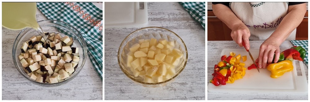 Wascht und trocknet die Auberginen, schneidet sie dann in Würfel und gebt sie in eine Schüssel; bestreut sie mit Salz (am besten grobes Salz), bedeckt alles mit Wasser und legt einen Teller darauf; lasst sie mindestens 30 Minuten einweichen.