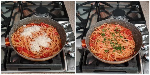 Entfernen Sie die Knoblauchzehen aus der Sauce und geben Sie die Spaghetti hinein. Beenden Sie das Kochen der Pasta, indem Sie nach und nach so viel Kochwasser hinzufügen, wie benötigt wird. Rühren Sie oft um, damit die Spaghetti gleichmäßig garen.