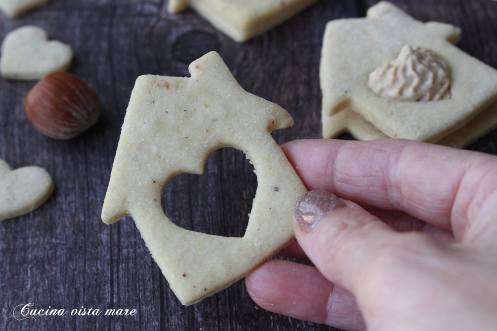 Nach der Ruhezeit den Mürbeteig mit dem Nudelholz auf eine Dicke von 5 Millimetern ausrollen und die Kekse ausstechen (der Hausförmige Ausstecher wird auf der einen Seite verwendet, um die Kekse mit einem Herz auszustechen, und auf der anderen Seite für die ganzen Kekse). Auf ein mikroperforiertes Backblech legen und für 15 Minuten zurück in den Kühlschrank stellen.
