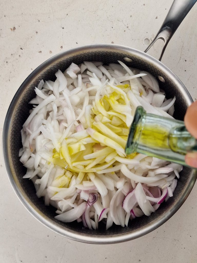 • Übertragen Sie die Zwiebeln in eine große Pfanne, geben Sie einen Schuss Olivenöl und eine Prise Salz dazu. Decken Sie die Pfanne ab und lassen Sie die Zwiebeln etwa 40 Minuten bei niedriger Hitze garen, dabei gelegentlich mit einem Holzlöffel umrühren.